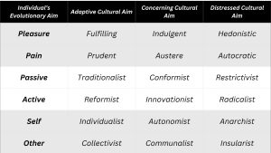 The three motivating aims polarities, which outline adaptive/evolutionary imperatives of individuals, may also be mapped onto sociocultural constructs that characterize the norms, values, and adaptive strategies emphasized within a culture. This mapping helps clinicians understand how personality operates within (and reacts to) its cultural ecology.
